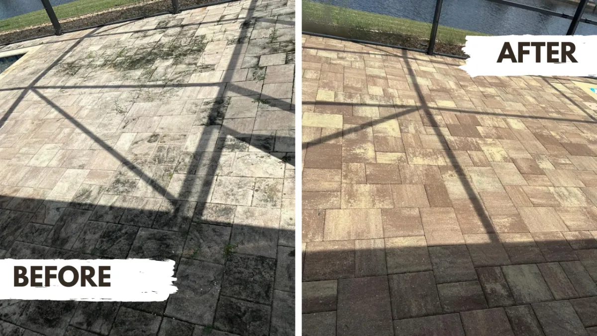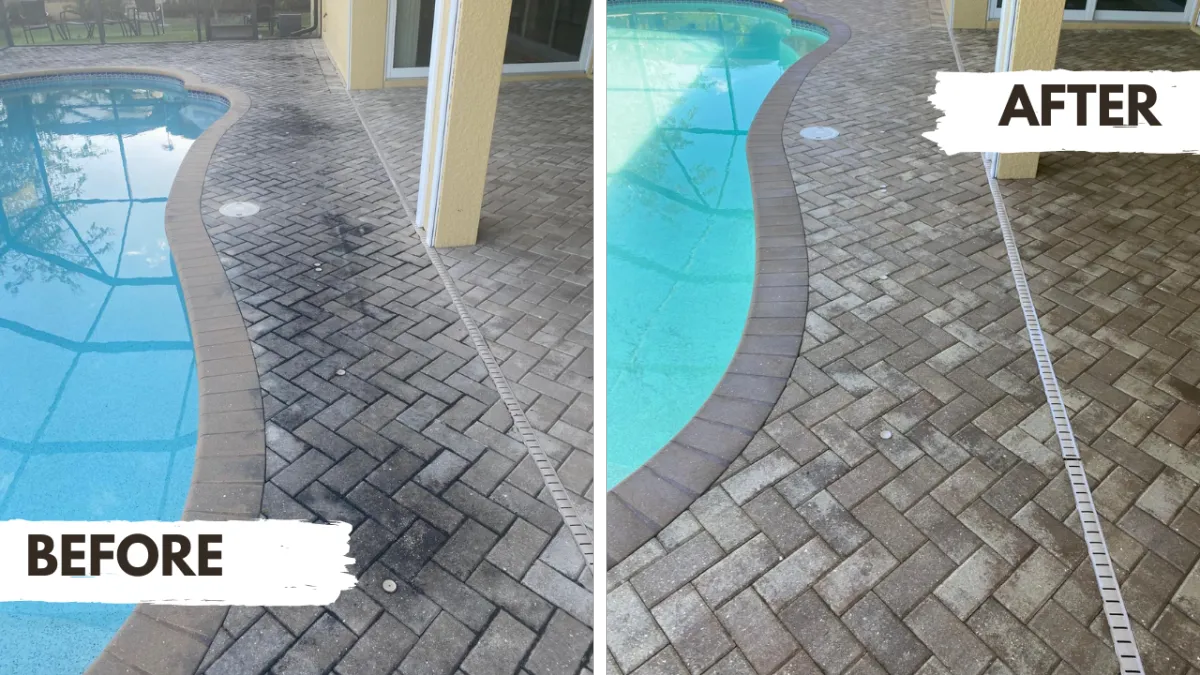 This pool deck was professionally cleaned, restored, and sealed to remove heavy buildup, restore the natural paver color, and protect the surface from moisture, mold, and wear.